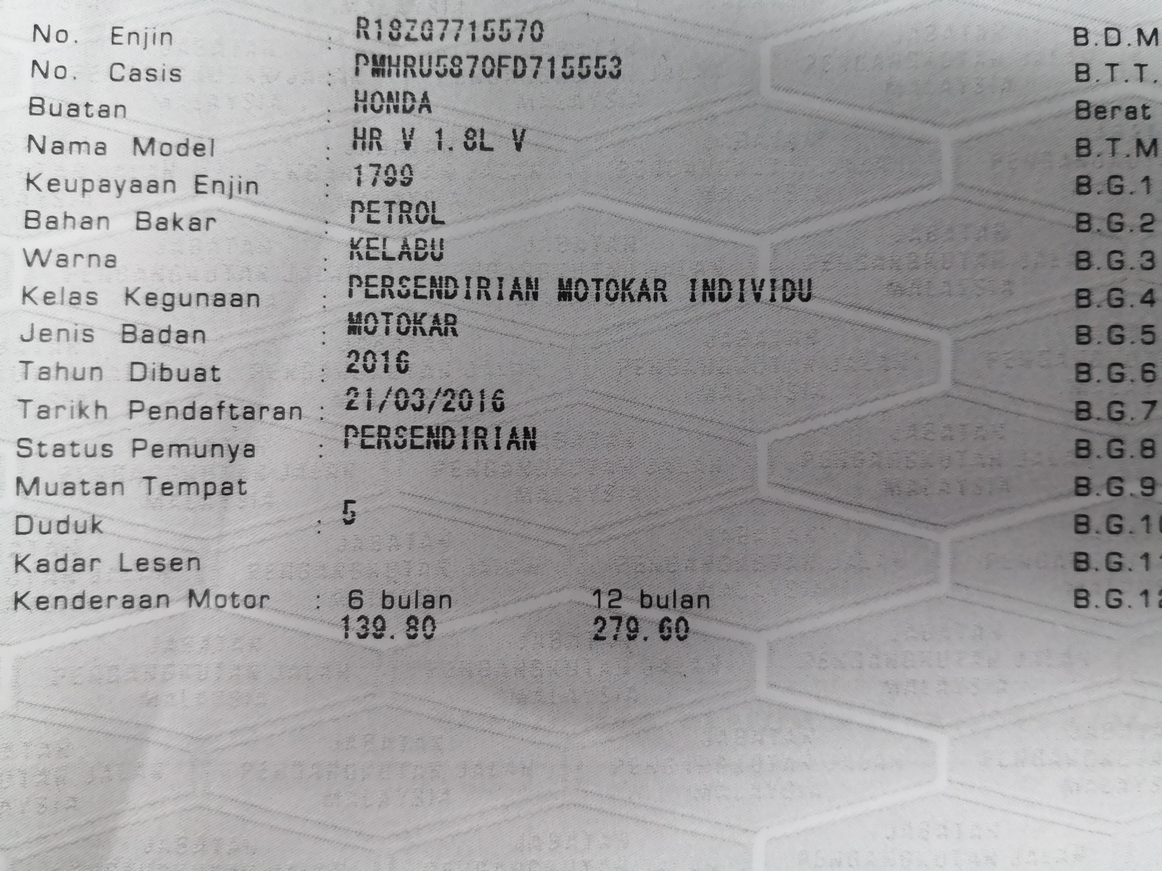 2016 本田HR-V 1.8 I VTEC V 全规格真实年份制造 2016 全方位服务 KAH MOTOR 71000 仅公里 ( 1 一年保修 )