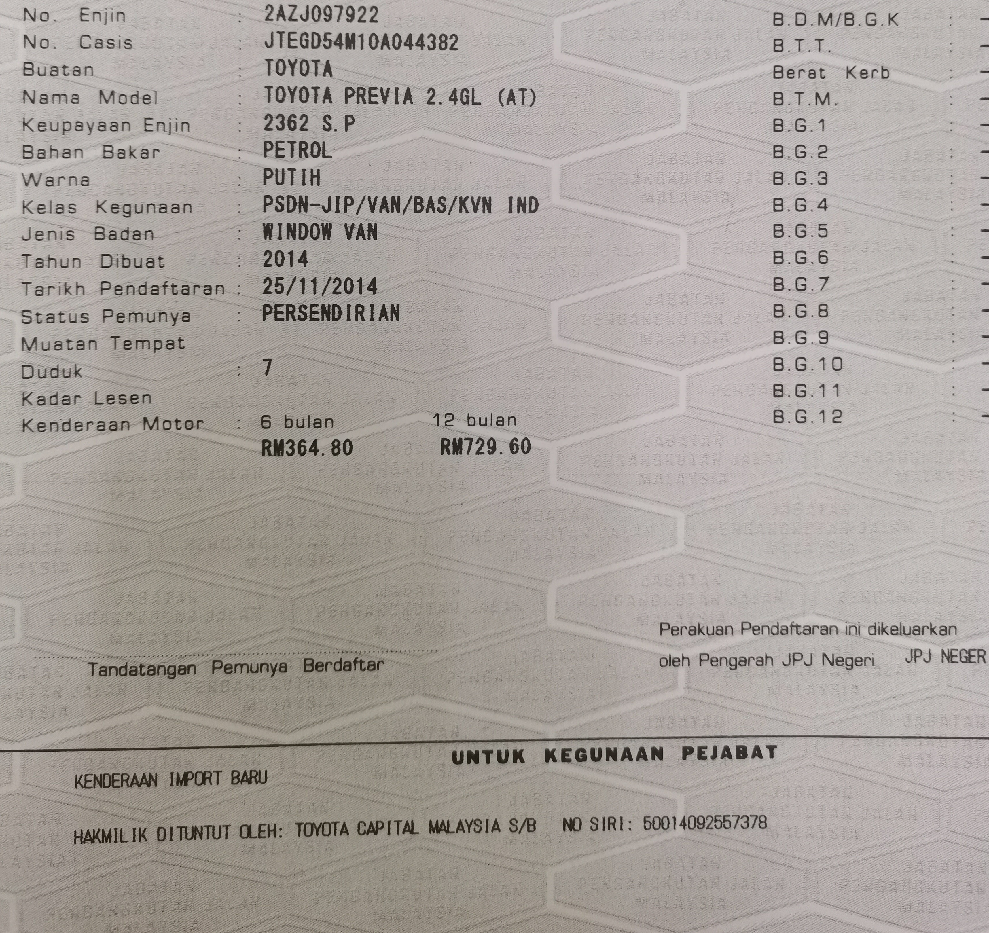 2014 丰田普瑞维亚 (尊重) 2.4 GL (一个) CBU 2 保修一年